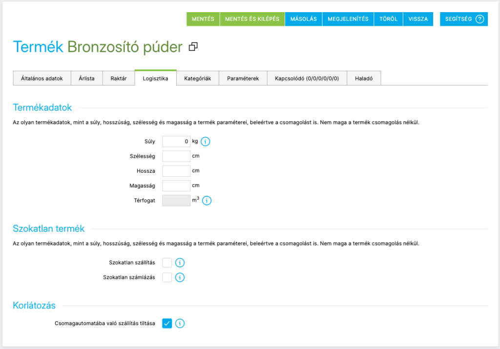 A beállításokat a Logisztika fülön találod a termékadatlapon. Különösen hasznos például olyan termékeknél, amelyek kis súllyal rendelkeznek, de a méretük miatt nem férnek be az automatába. Azoknál a partneri alkalmazásoknál, amelyek saját widgetben kínálnak automatákat, a funkció működéséhez partneroldali implementáció szükséges. Emiatt előfordulhat, hogy ez a widget típus továbbra is felkínálja a csomagautomata választását. Ha testre szabott megoldásokat használsz, az automatás kézbesítés tiltására vonatkozó információt a kosár adataiban találod.